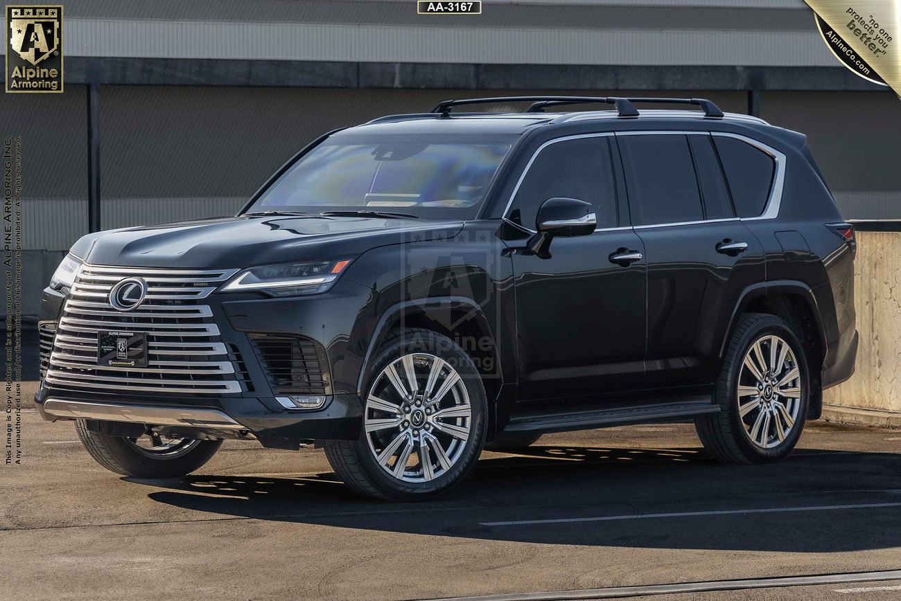 This Lexus LX600 SUV is armored to Alpine Level A9 (CEN B6+) with high-grade materials including laboratory-tested, certified ballistic steel (opaque) and bullet-resistant glass (transparent) that offer protection against AR-15 and many other high-power rifles including 7.62 x 39, 7.62 x 51, 5.56 x 45, and M80 ball rounds.