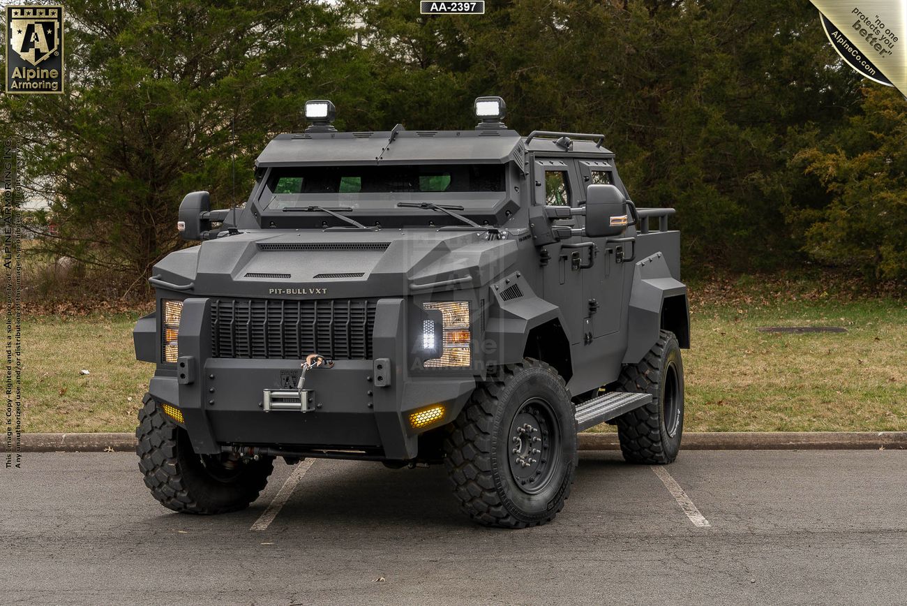This bulletproof Pit-Bull VXT® APC is armored to Alpine Level A9 (CEN B6+) with laboratory-tested, certified ballistic steel and bullet-resistant glass, providing protection against ballistic threats, explosive devices, and other hazards such as AR-15 and many other high-power rifles including 7.62 x 39, 7.62 x 51, 5.56 x 45, and M80 ball rounds, as well as floor protection against two (2) DM51 hand grenades.