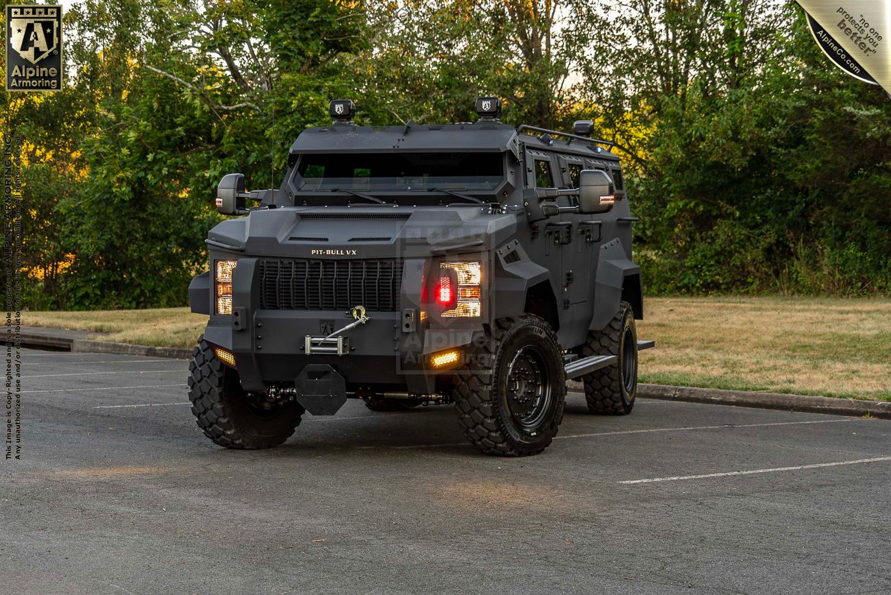 Heavily armored to the highest level, Alpine Level A12/.50 Cal (Level B7+), with laboratory-tested, certified ballistic steel and bullet-resistant glass, this next-gen bulletproof Pit-Bull VX® stops .50 caliber rounds, .30-06, 7.62x51AP, 5.56x45AP, and 7.62x39AP.