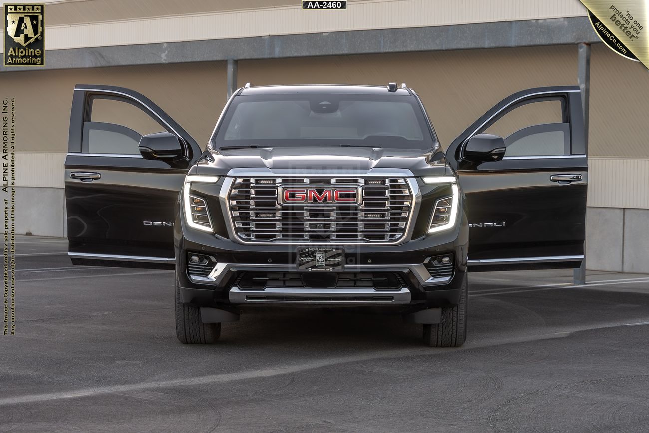 Modificado según el nivel Alpine A9 (CEN B6+) con blindaje certificado y probado en laboratorio y cristales antibalas en todas las ventanillas, nuestro GMC Yukon Denali blindado protege a los ocupantes contra AR-15 y muchos otros rifles de alta potencia, incluidas balas de 7,62 x 39, 7,62 x 51, 5,56 x 45 y M80, así como protección del suelo contra dos (2) granadas de mano DM51. Las opciones adicionales para aumentar la seguridad de nuestro GMC Yukon Denali XL blindado incluyen escape antisabotaje, una puerta batiente de separación trasera con un gran cristal de visión balística y protección del depósito de combustible. Las personalizaciones incluyen frenos y suspensión mejorados, luces estroboscópicas LED, sistemas multisirena, de intercomunicación y megafonía, y cuatro inserciones run-flat de alta calidad.