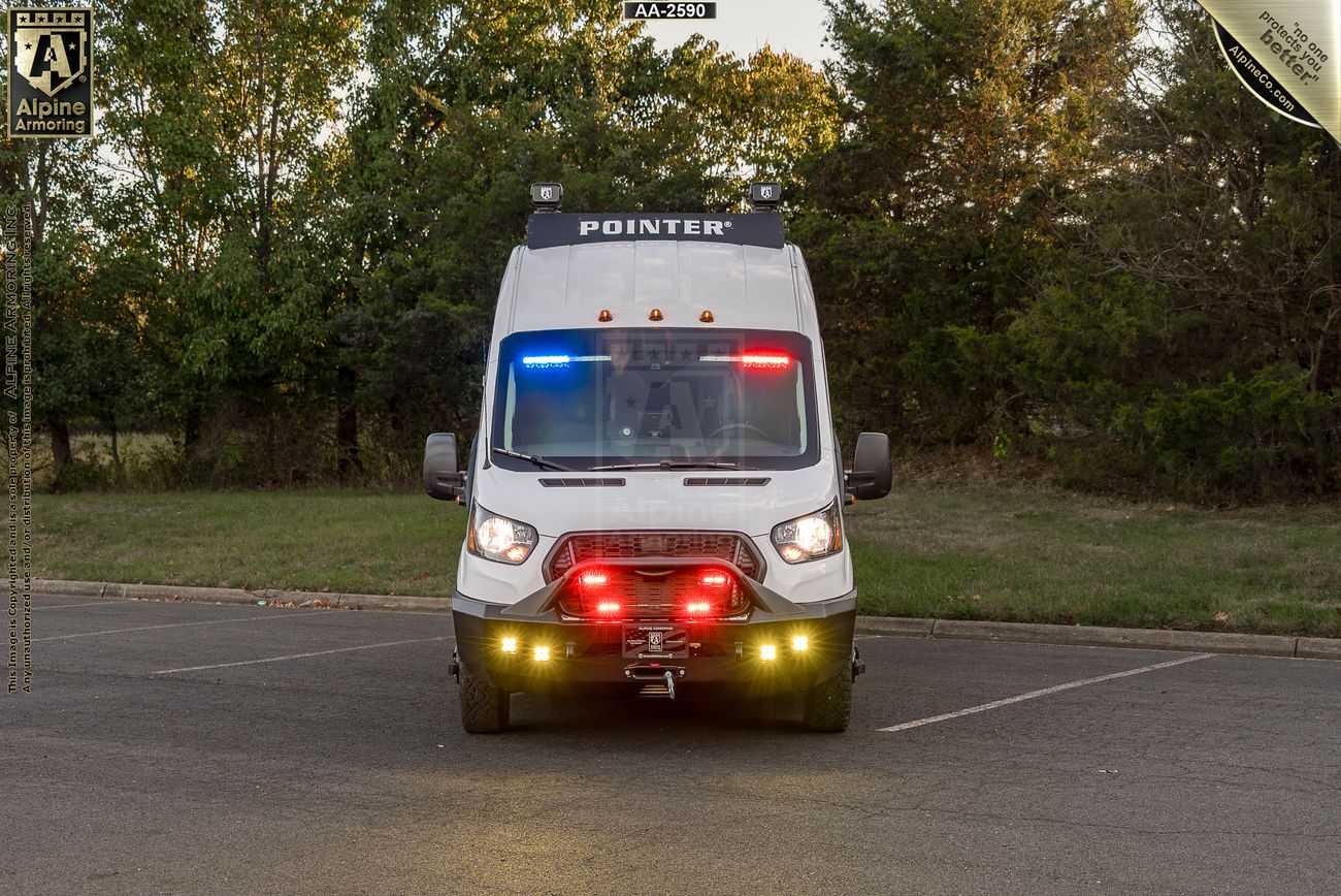 El furgón SWAT POINTER® de Alpine Armoring es un vehículo altamente especializado diseñado para equipar a las fuerzas del orden y al personal militar con la protección necesaria y las capacidades tácticas que necesitan para llevar a cabo misiones seguras y eficaces. Construido sobre el chasis del Ford Transit, el furgón blindado POINTER® tiene un potente motor Ecoboost V6 de 3.5L y un sistema de suspensión reforzado que le permite navegar por terrenos difíciles y manejar persecuciones a alta velocidad.