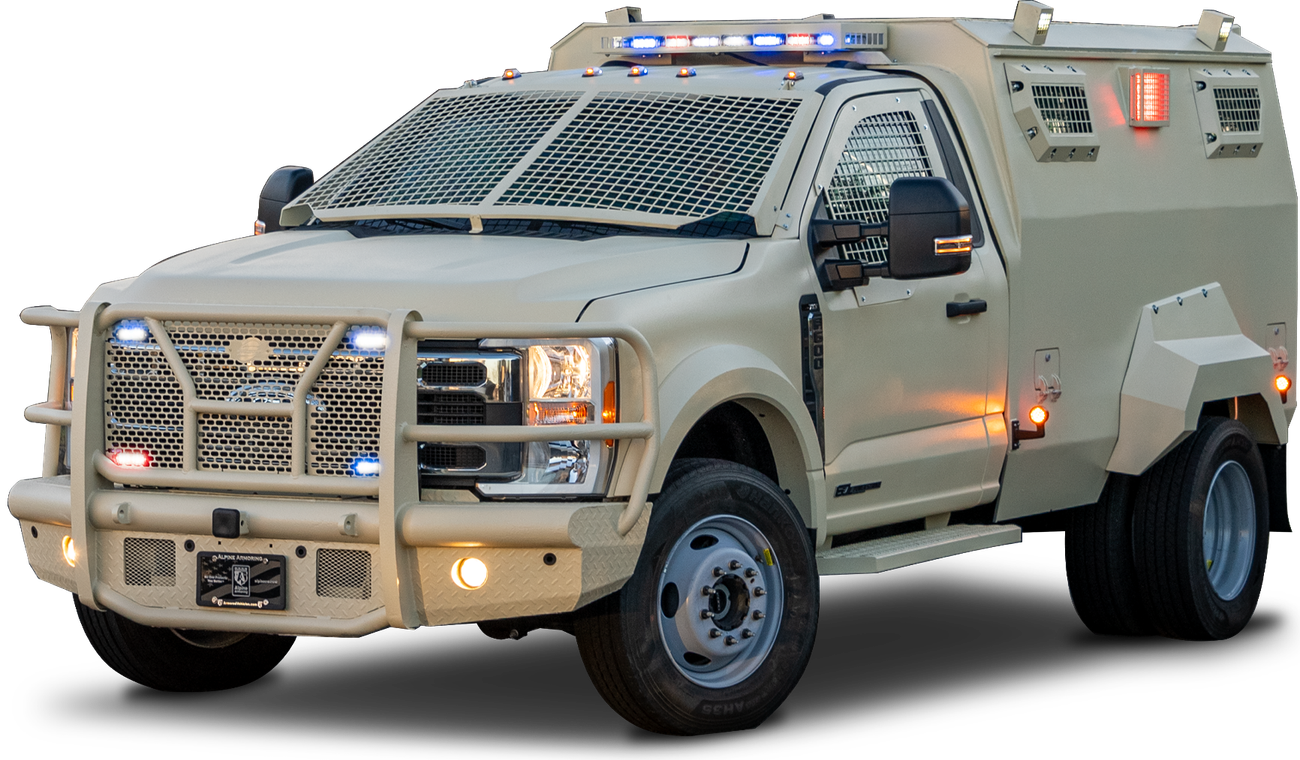 Built for medical use in high-conflict areas, Alpine’s Omicron® armored ambulance is designed to help keep combat medics and patients safe in the most challenging environments. Built on a heavy-duty chassis with a powerful diesel engine, the Omicron bulletproof ambulance can quickly evacuate from dangerous situations, while the advanced suspension allows it to navigate through rough terrain. Alpine Armoring’s bulletproof ambulance is equipped with the necessary equipment and supplies to provide life-saving care to patients, including a full-size stretcher, oxygen supply tank, storage cabinets for additional medical equipment, and seats for attendants.