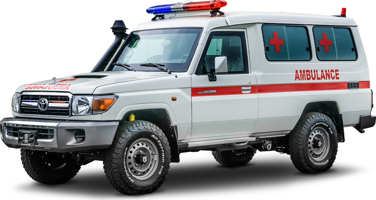 Alpine's Armored Toyota Ambulance is built on a heavy-duty Toyota Land Cruiser 78 chassis with a powerful diesel engine and advanced suspension, designed for medical use in high-conflict areas. It allows combat medics to quickly evacuate patients from dangerous situations and navigate through rough terrain. This bulletproof Toyota ambulance is equipped with life-saving medical equipment, including a full-size stretcher, oxygen supply tank, and storage cabinets for additional supplies, as well as seats for attendants.