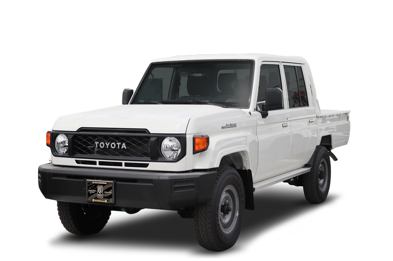 Our bulletproof Land Cruiser 79 pickup truck is available in armoring levels from Alpine Level A4 (CEN B4) to Alpine Level A12 (B7+) to help protect you in possible life-threatening situations. Alpine’s armoured Toyota LC79 truck can be customized with a variety of advanced safety features and accessories including a heavy duty brake kit, multi-siren and public announcement system, anti-sabotage exhaust protection, LED strobe lights, Run-Flat inserts, and more.